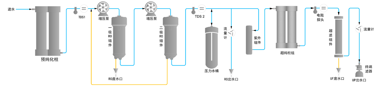 | 二級RO水 | 二級RO離子截留率≥99%、電導(dǎo)率小于等于5μs/cm,顆粒和細(xì)菌截留率>99%(MW>200道爾頓) | |||
