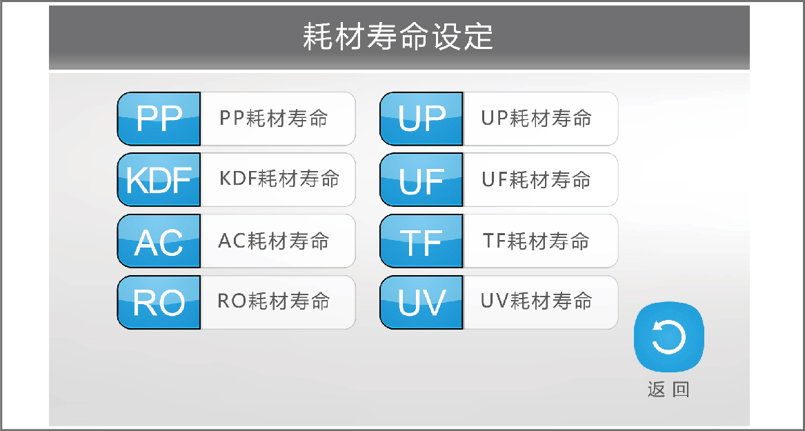 - ·PP、KDF、AC、RO、DI、UP、UV、UF、TF 耗材壽命可設(shè)定,顯示已使用時(shí)間及用量,到期自動(dòng)提醒更換